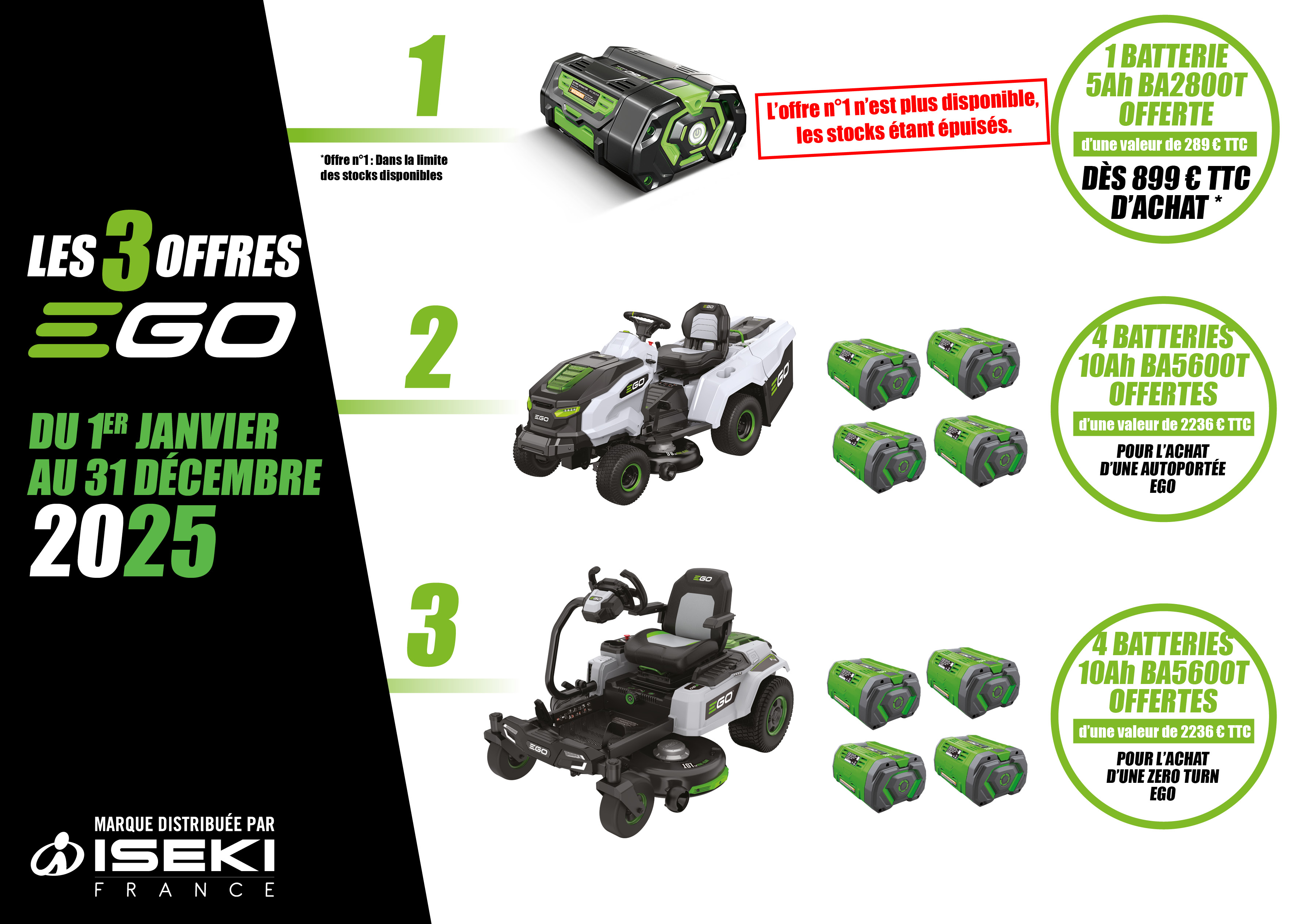 - 4 batteries 10Ah BA5600T offertes d’une valeur de 2 236€ TTC pour l’achat d’une zéro turn EGO